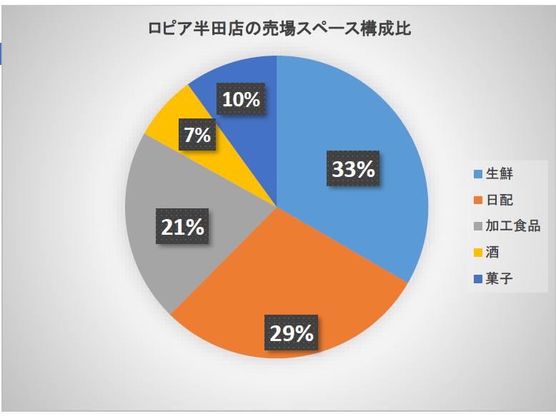 売場面積は約560坪(歩測)で、ロピアが最も強みを発揮できる規模である。部門別の売場スペース構成比は生鮮33%、日配29%で両部門合計は62%。ロピアでは標準規模で、売場配置も既存店のモデルをほぼ踏襲している。