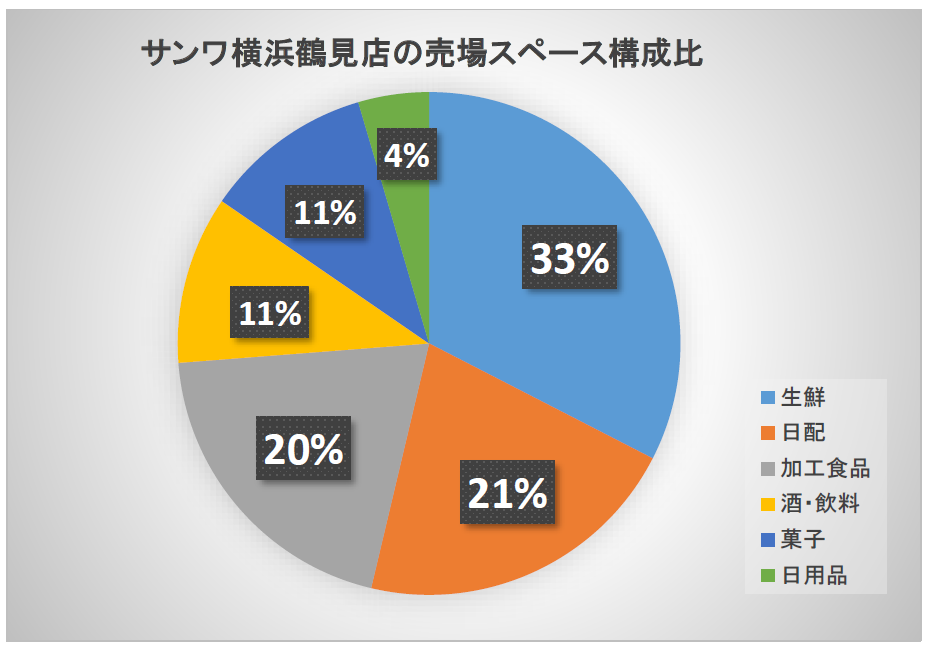 横浜鶴見店の売場はほぼ正方形で、面積は約400坪(歩測)と、標準規模に収まっている。売場スペースの構成比を見ても、生鮮33%、日配21%、両部門合計で54%を占めており、安定した構成だ。