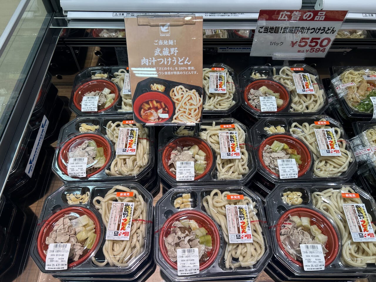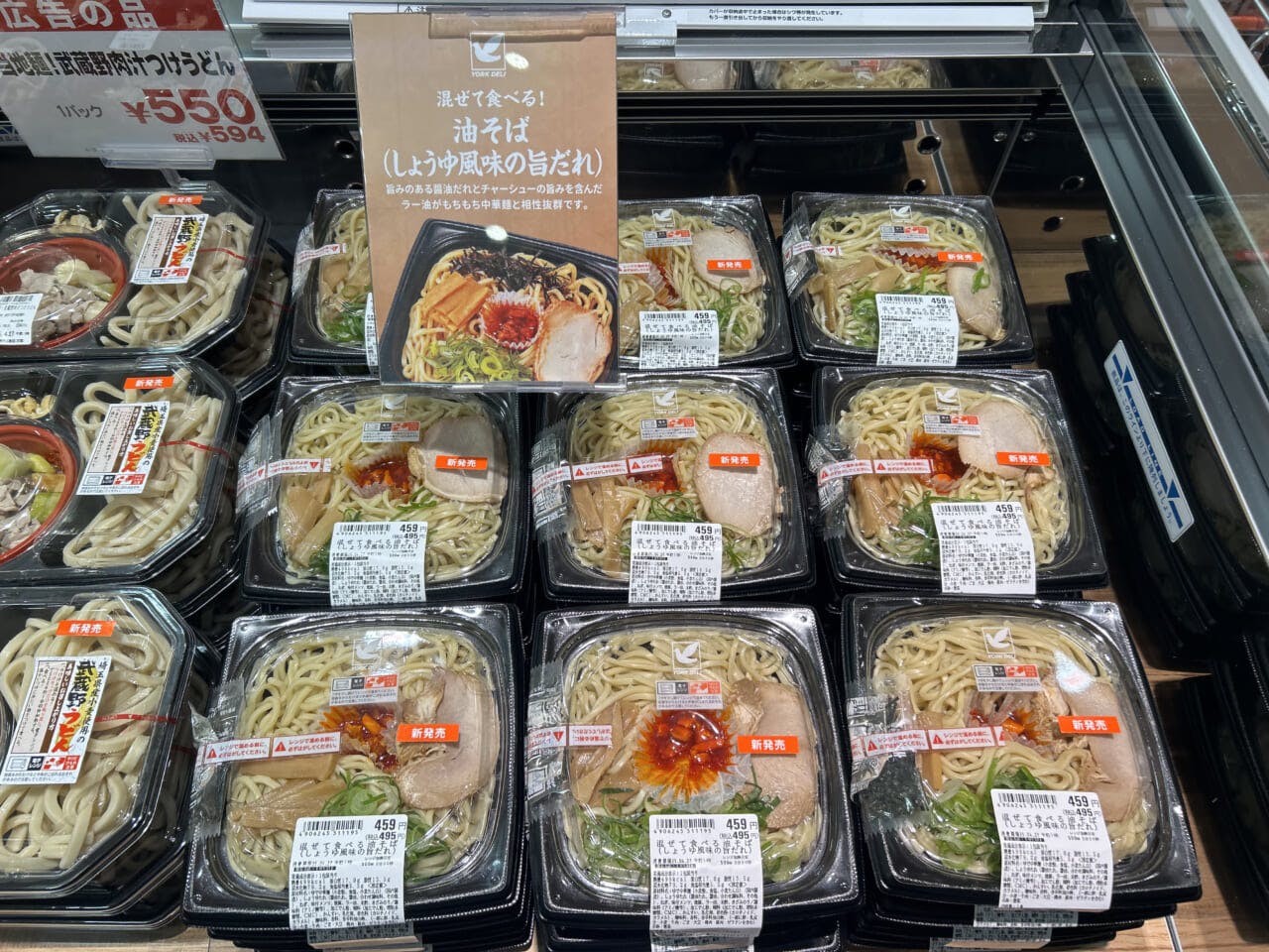 そのほか、麺類の商品では、ご当地商品として埼玉県産小麦「さとのそら」を100%使用した「武蔵野肉汁つけうどん」(550円)を販売しているほか、量感のある「混ぜて食べる!油そば(しょうゆ風味の旨だれ)」(459円)などを並べていた。
