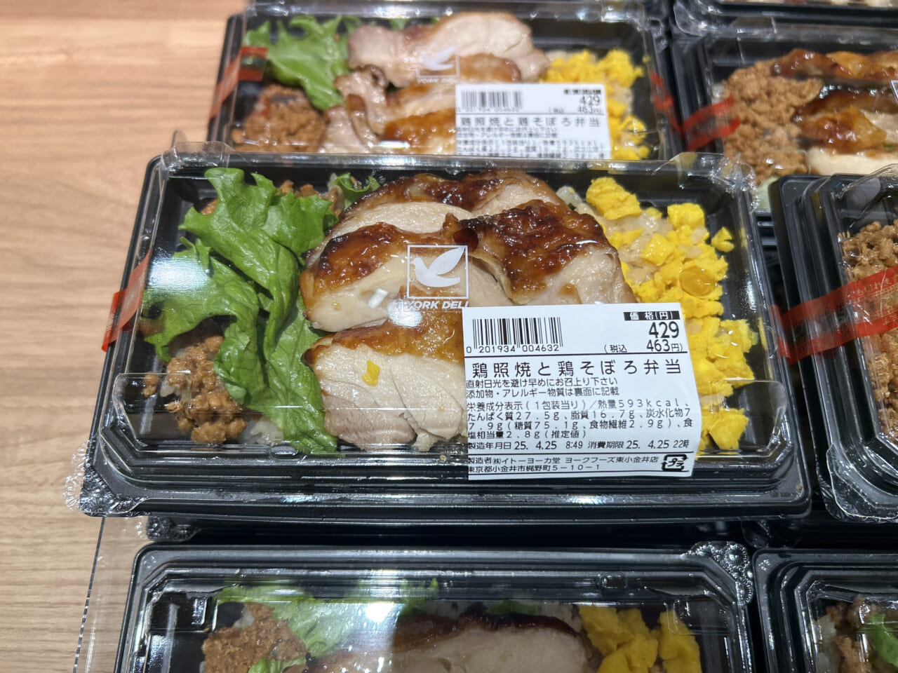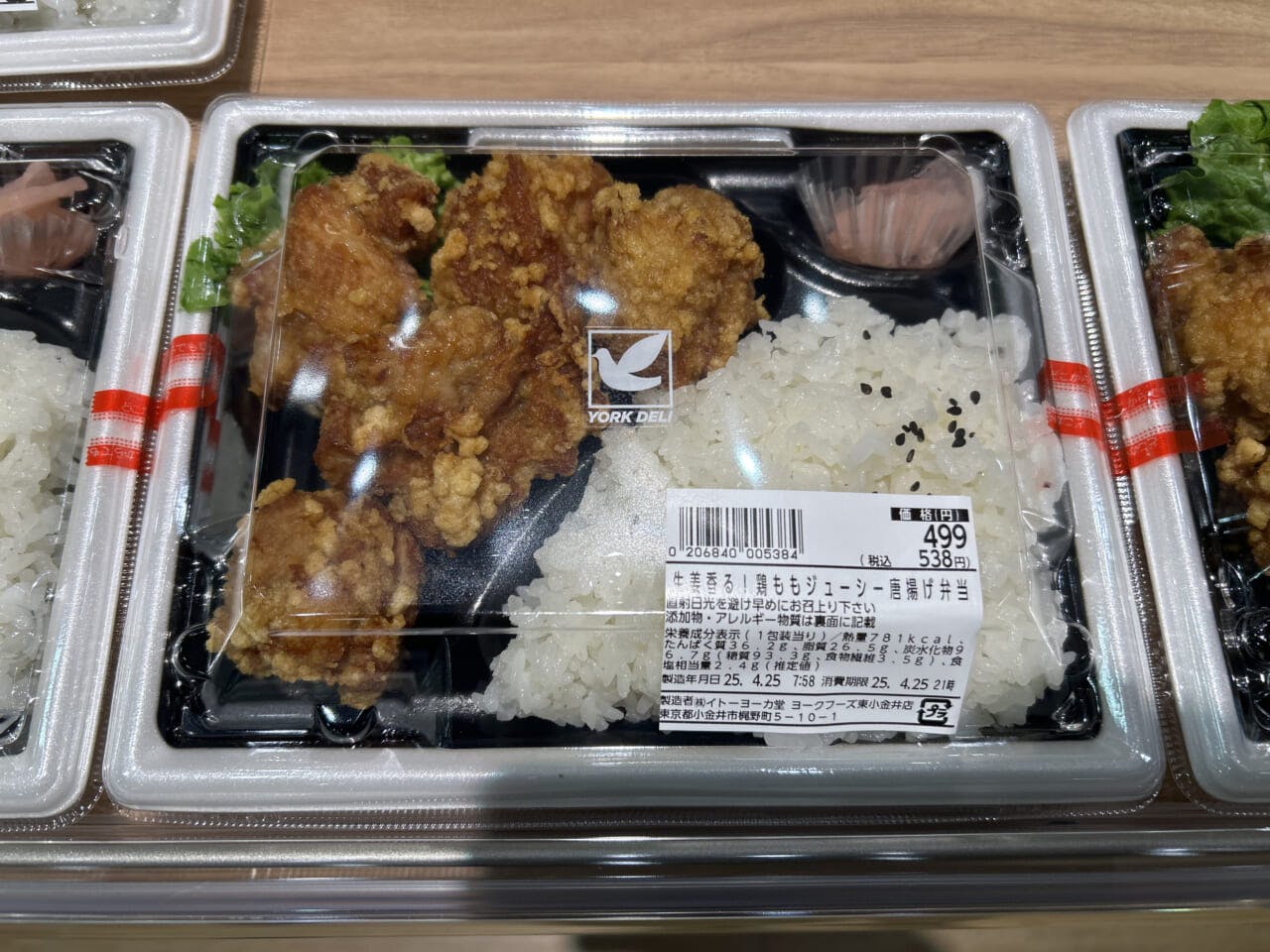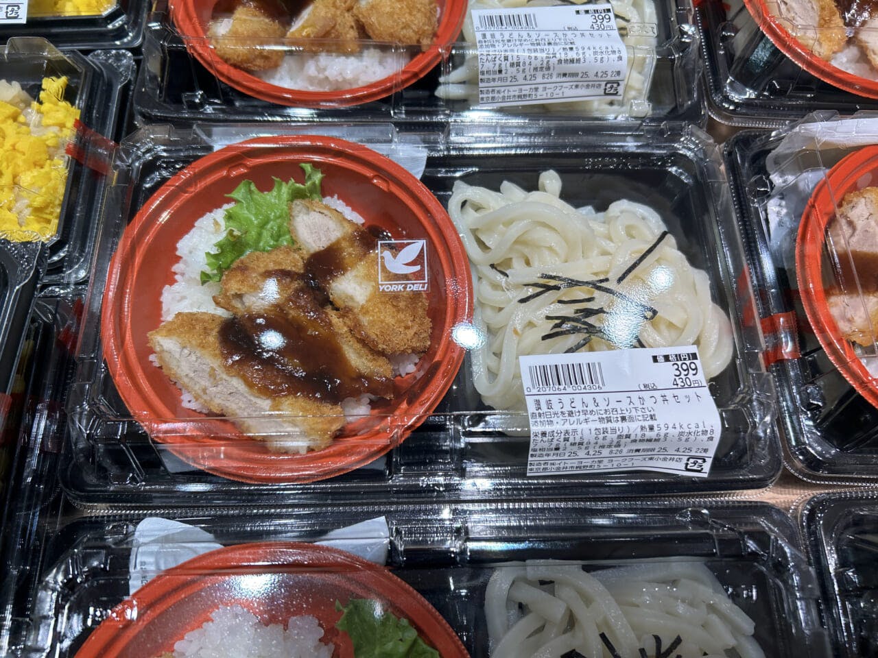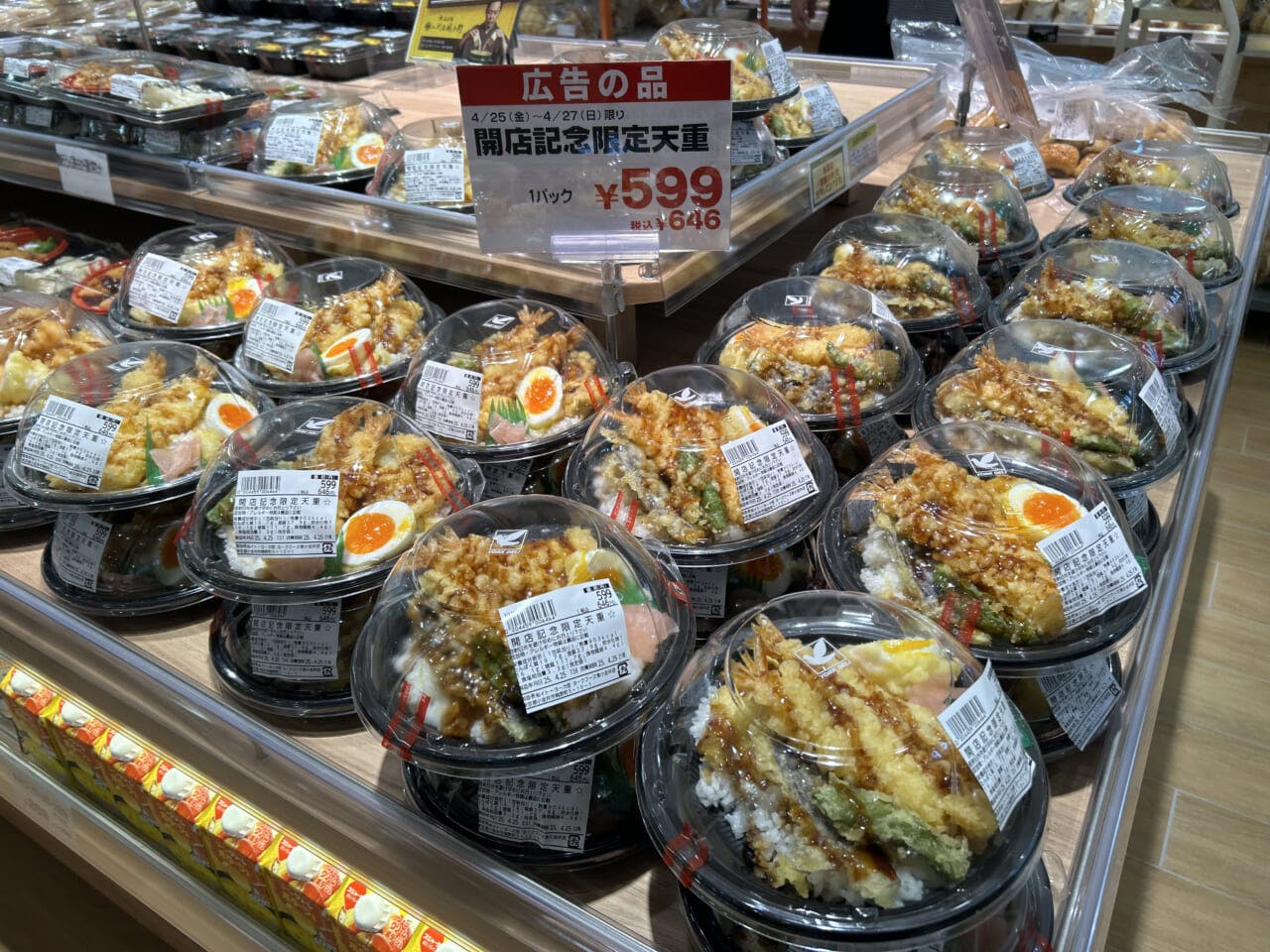 米飯では、京都の老舗米屋「八代目儀兵衛」監修の米を使用していることをPOPでPR。商品では、海老、なすの天ぷらや半熟卵の乗った「開店記念限定天重」(599円)が平台で存在感を放っていたほか、「鶏照焼と鶏そぼろ弁当」(429円)、「生姜香る!鶏ももジューシー唐揚げ弁当」(499円)、「讃岐うどん&ソースかつ丼セット」(399円)など幅広いラインアップを揃えていた。