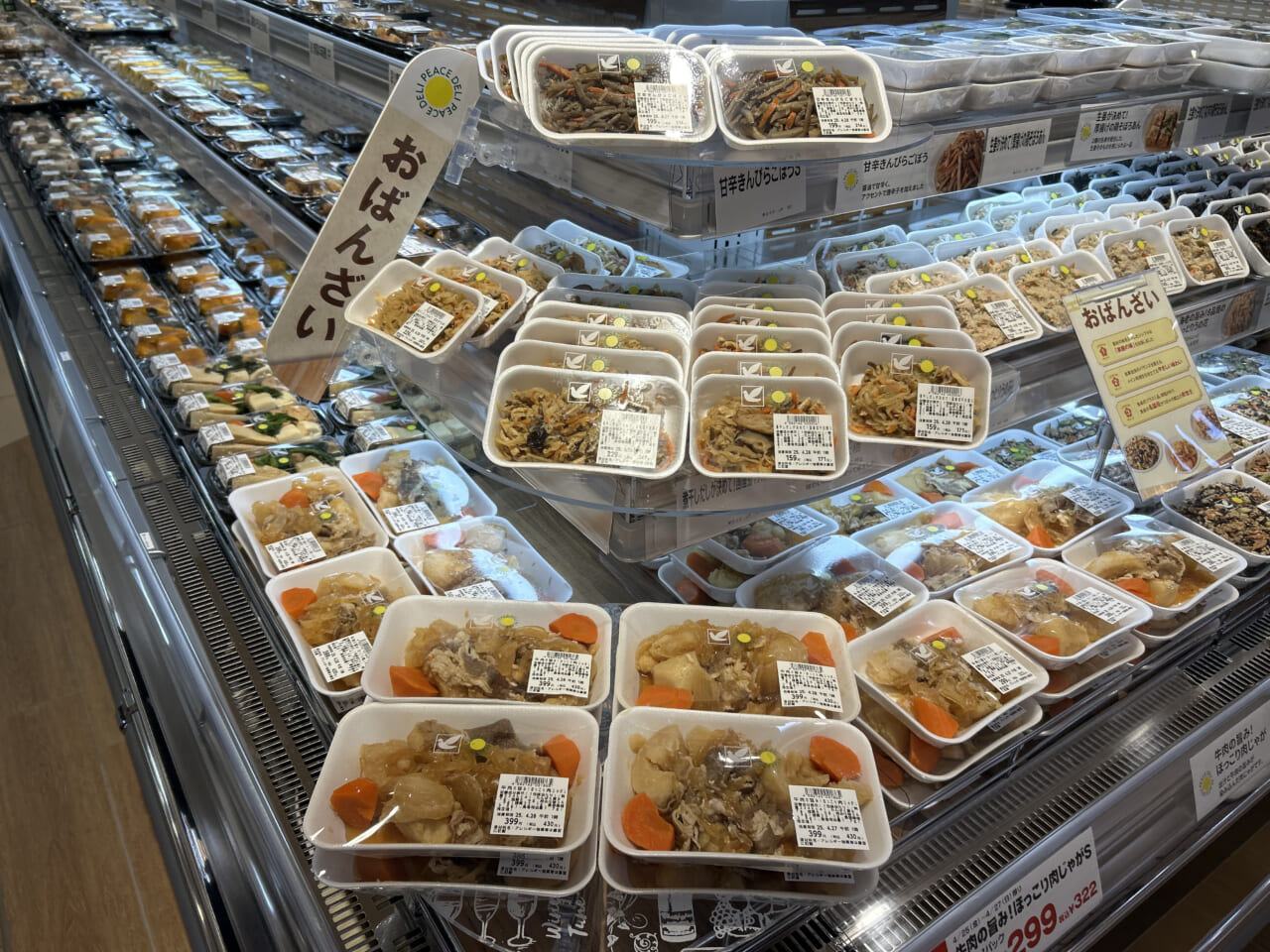 自社総菜工場「ピースデリ」供給の商品も豊富に揃える