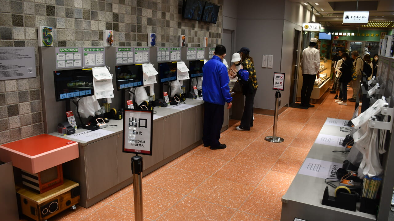 施設内のショップは、各店舗内のセルフレジで端末を操作して商品を購入できるショップが集まったセルフレジエリアと、複数ショップの商品をまとめて会計する「集中レジ」のエリアに分かれている。