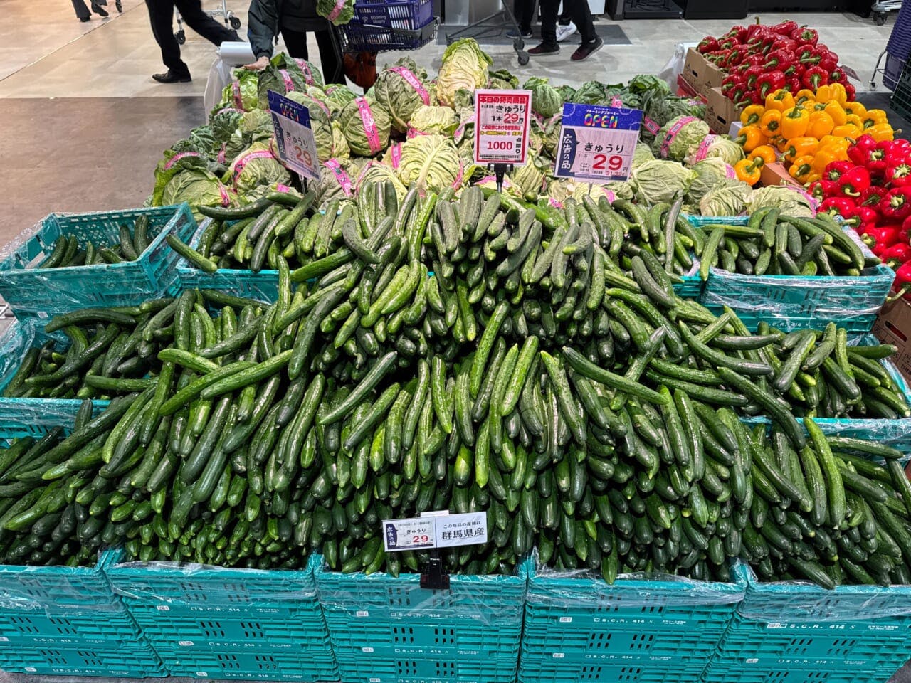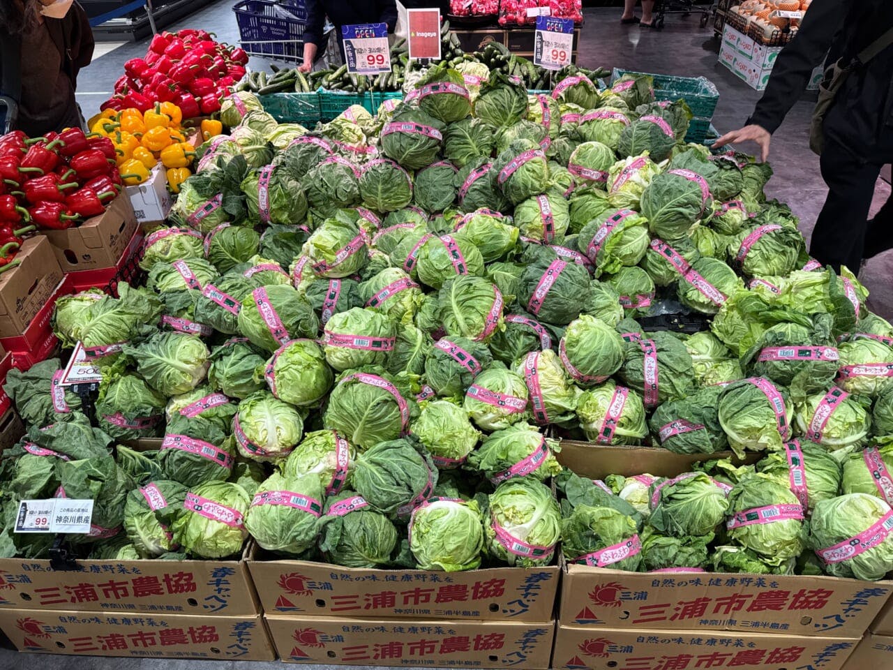 同店の強力な集客装置となっているのが、日替わり価格で提供する旬の野菜だ。取材時は「本日の特売商品」として「三浦のふわふわ本春きゃべつ」(1玉99円)、「きゅうり」(1本29円)などを入口付近で大量に陳列していた。