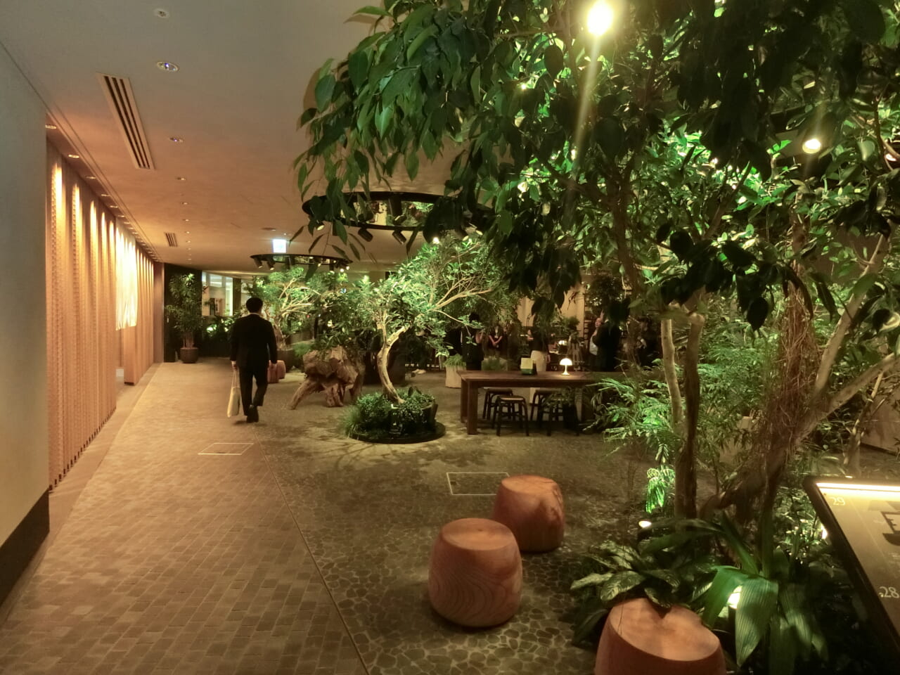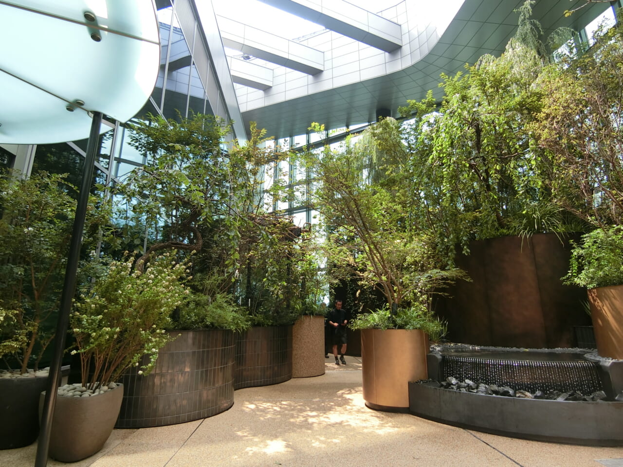吹き抜けのある約8000㎡のフロアには、沖縄や八丈島、神奈川など全国から集めた500本以上の大形樹木を屋内外に配置。樹齢100年を超える「チャボヒバ」も植えられている。
