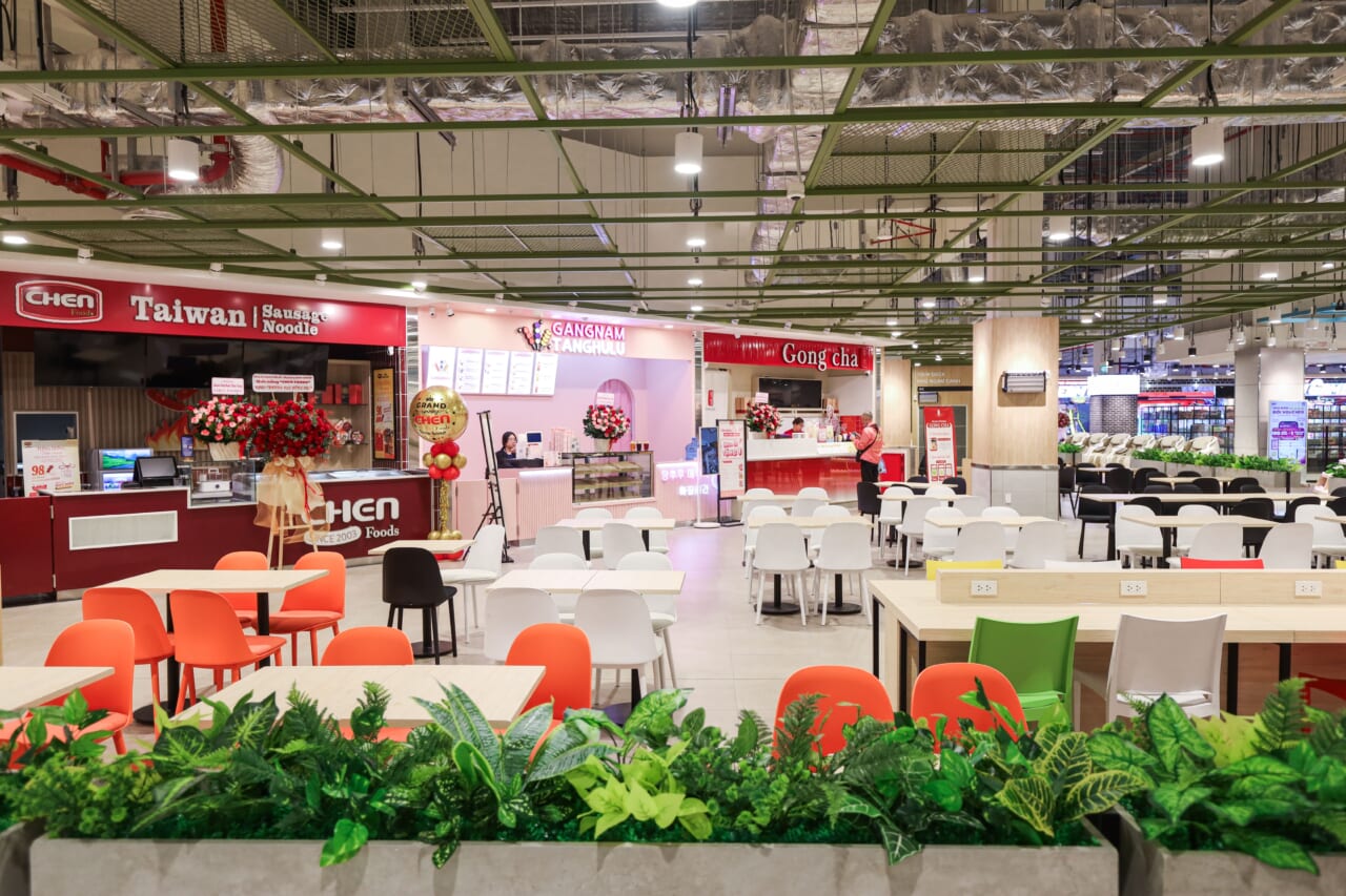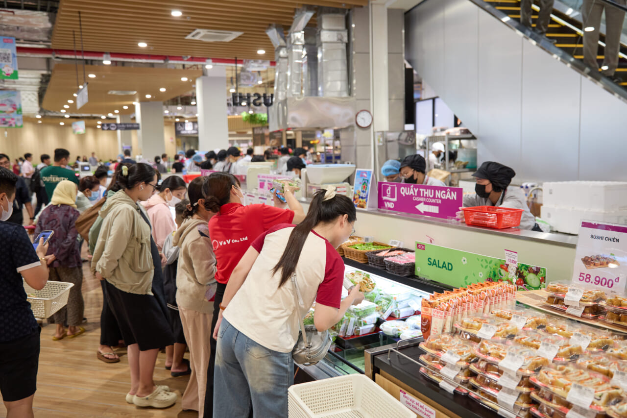 1階は食品スーパー売場、デリカ売場のほか、「スターバックス」をはじめとした人気の飲食店が出店する食品中心のフロアだ。デリカ売場は、売場面積750㎡の広さに「セルフサービス型フードコート」として展開する。寿司やおにぎり、サラダバー、ベーカリーなど豊富なメニューを揃えており、イートインは188席を備えている。ローカライズしたメニューも多く、タンアンSCではベトナム南部・メコンデルタの味覚を楽しめる鍋料理を新たに投入した。人気の根強い寿司や、200種以上の商品を焼きたてで提供するベーカリーがソフトオープンでは大好評だったという。