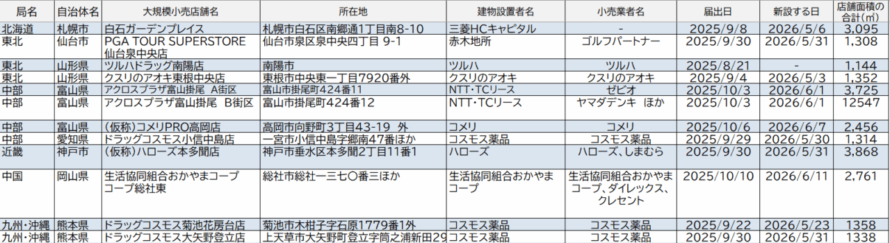 今週、新規に届出情報を確認できたのは12件。コスモス薬品(福岡県)が3件、クスリのアオキ(石川県)が1件、ツルハ(北海道)が1件と、出店意欲旺盛なドラッグストア企業が目立つ。