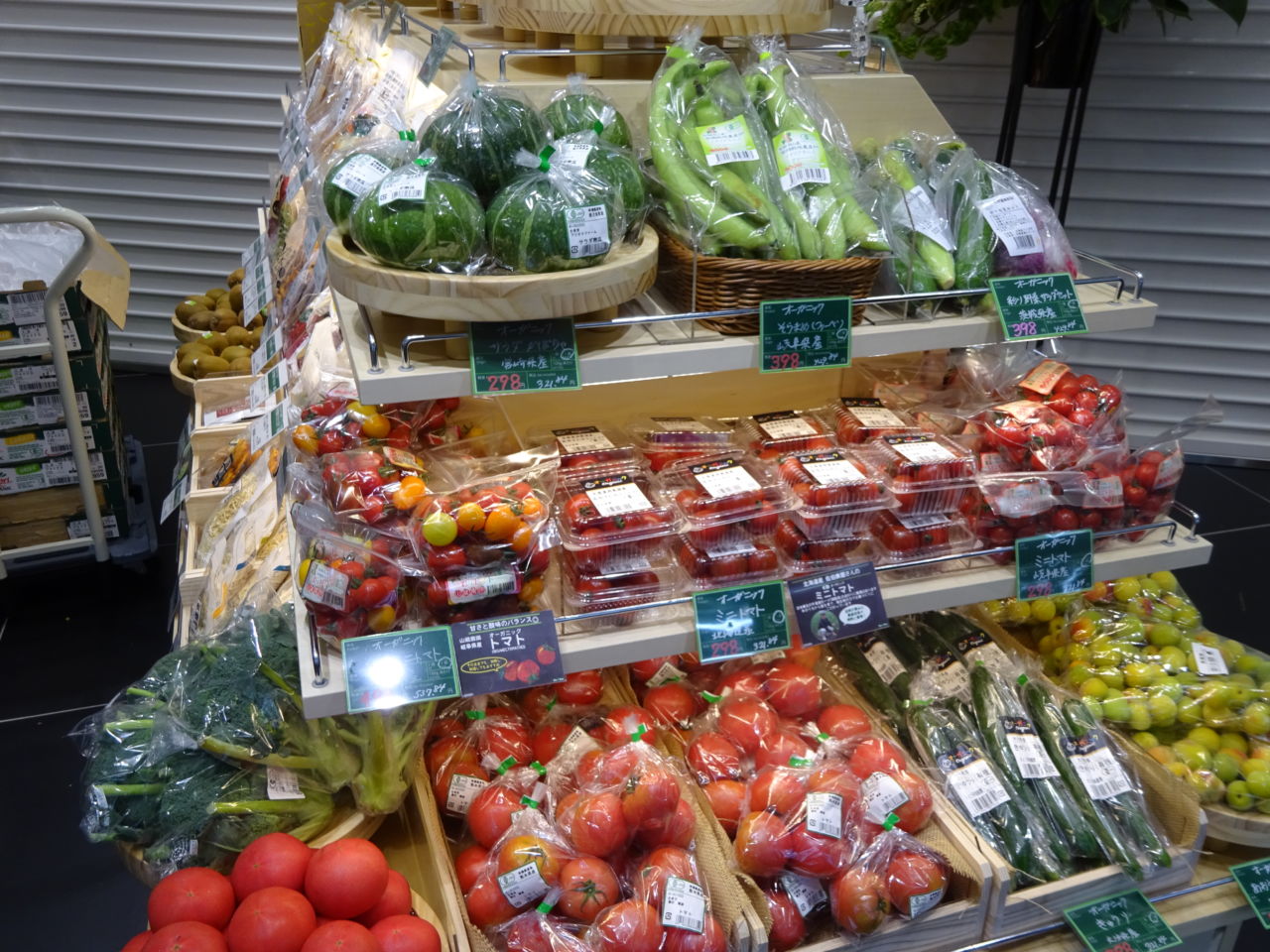 青果売場には定番野菜に加え、旬を迎えつつあるさまざまな品種のトマトや、比較的珍しい皮付きのヤングコーン、沖縄県産の小ぶりのパイナップルなどが並んだ。もちろんいずれもオーガニックで、全国から取り寄せた野菜が種類豊富に取り揃えられている。