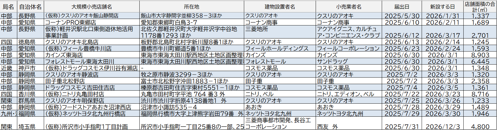 DCSオンライン編集部の調べによると、今週1週間(7月30日~8月5日)で新規に確認できた大規模小売店舗立地法(大店立地法)の届出情報は16件だった。経済産業省は2024年3月末に大店立地法の届出状況の公表を終了。以降は、各自治体が届出状況を公表している。今週の各社の動きを見ていこう。
