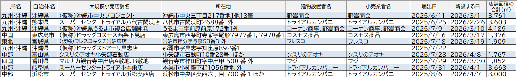 食品スーパーでは、福島県を本拠とするフレスコ、中四国リージョナルのフジ(広島県)、沖縄ローカルの野嵩商会が新規に届け出ている。このうち、野嵩商会は沖縄県の沖縄市、うるま市にそれぞれ新規出店する。「フレッシュプラザユニオン」などの屋号で、沖縄県内に食品スーパー21店舗を展開する野嵩商会。同社は24年3月、ロピアとのフランチャイズ契約のもと那覇市内に「ロピア沖縄国際通り店」を出店したものの、25年5月末をもって契約を終了。同店も25年5月31日に閉店し、翌月に新フォーマット「ユニオンスカラ国際通り店」としてリニューアルオープンしている。