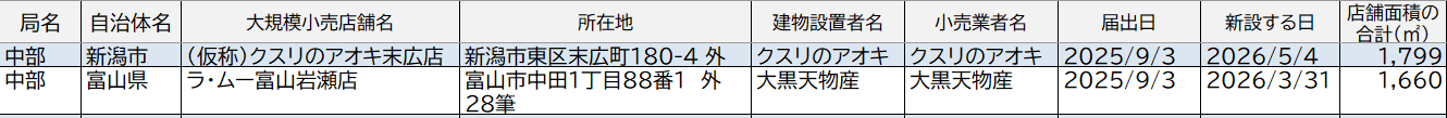今週、新規に確認できたのは2件。クスリのアオキ(石川県)が新潟県新潟市に「(仮称)クスリのアオキ末広店」、大黒天物産(岡山県)が富山県富山市に「ラ・ムー富山岩瀬店」を出店する。