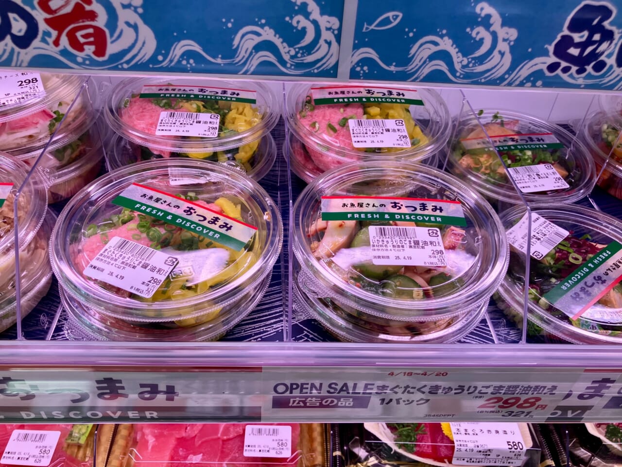 鮮魚売場は、切り身や刺身に加え「ボイルみずだこ頭ブツ切り」、「あんこう肝スライス(もみじポン酢付)」「いわしのごま漬け」(各同398円)などの加工商品を揃える。そのほか、「あさりのぬた」「カナダホッキ貝ひものぬた」(各同298円)といった「お魚屋さんのおつまみ」シリーズを販売する。