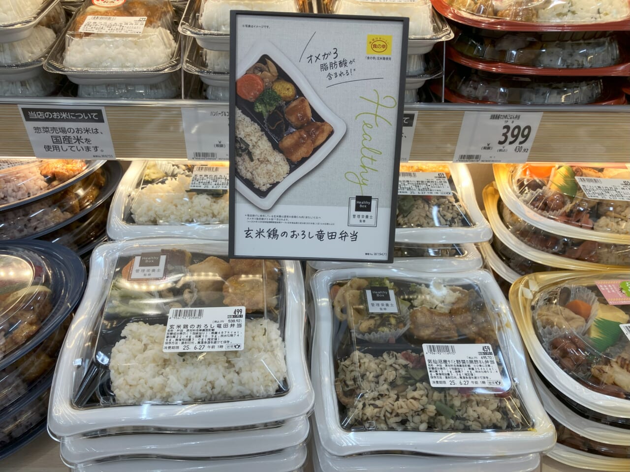 弁当類は、アウトパック商品に加えて、西友の北関東工場や埼玉工場で製造した自社製品を揃える。「玄米鶏おろし竜田弁当」(499円)や「気仙沼産サバと野菜の黒酢あん弁当」(459円)など、健康志向を意識した商品を展開する。