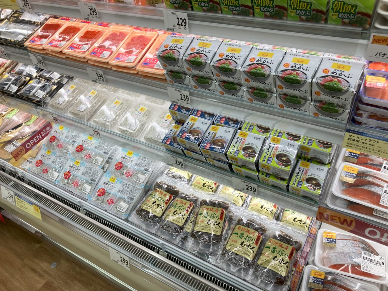 鮮魚では、刺身の商品を中心に扱い「食の幸」シリーズから「かつおのたたき(刺身)」(313円)や「サーモントラウト(刺身用)」(555円)などを販売する。また、単身世帯のニーズに合わせて、めかぶやもずくなど、少量で手軽に食べられる商品も展開する。