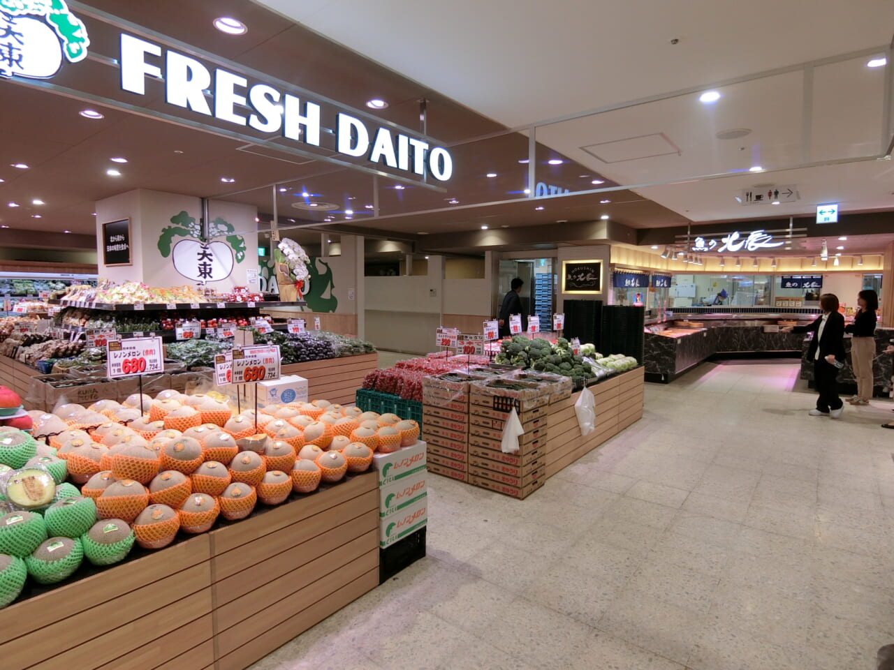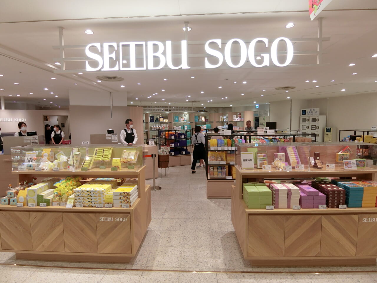 地下1階は食品と飲食を集積した「川口フードマーケット」。SMは「成城石井」(約44坪)に加え、生鮮三品は青果「フレッシュダイトー」、鮮魚「魚の北辰」、精肉「ニュークイック」が担う。そごう・西武(東京都/田口広人社長)は、和菓子やスイーツを扱う4店舗目のギフトショップ「西武・そごうショップ」(約40坪)を出店した