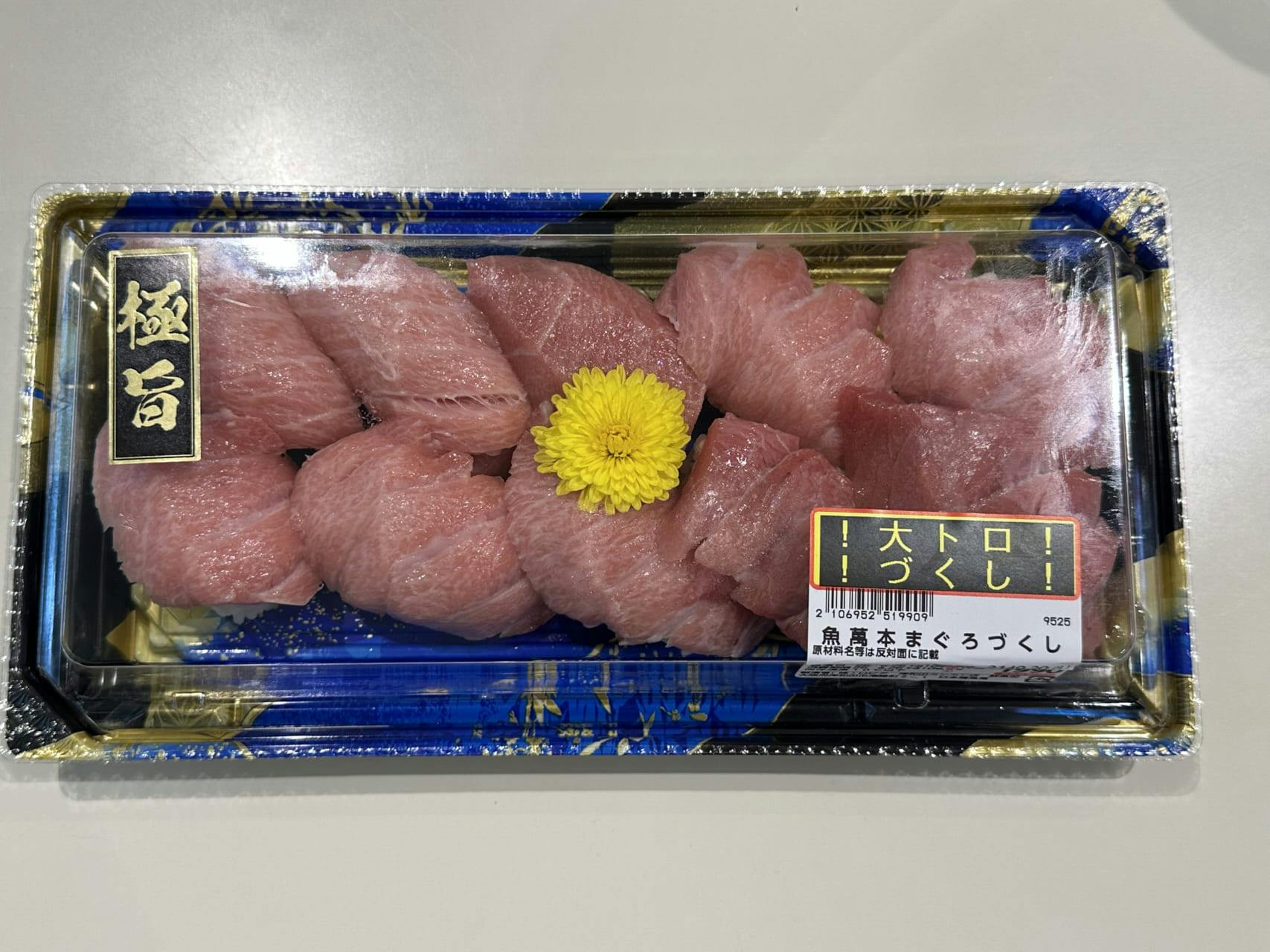 また、オープン特別企画として、鳥取県境港で水揚げされた天然生本まぐろを1サク1200円で販売していた。この本まぐろはロピアの他店店舗では取り扱いがなく、目玉商品としてフェース数を確保したかたちで展開されていた。その天然生本まぐろを使用した握り寿司も大々的に展開している。大トロ部分のみの握り寿司10カンは1990円、赤身部分の握り寿司は18カン入りで1990円と、高単価ながらインパクトのある商品化がされており、売れ行きも上々であった。