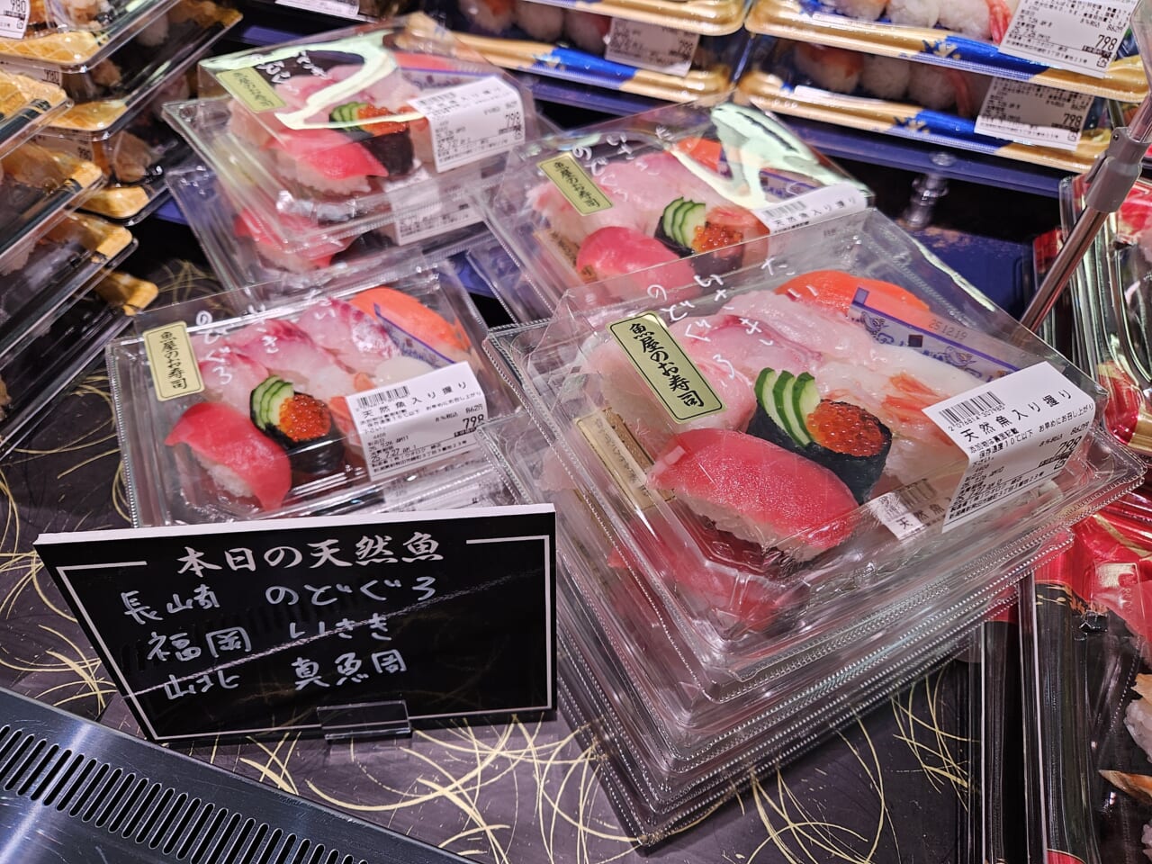 即食商品も充実しており、海鮮丼や握り寿司、弁当のほか、揚げ物や煮魚などバラエティ豊かな品揃え。「天然魚入り握り」など、売場に並ぶ新鮮な丸物を原料に使用した商品も差し込んでいる。