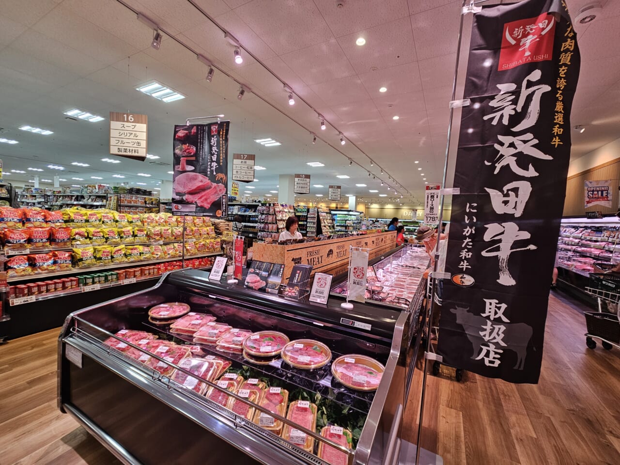 精肉は、地元のブランド牛「新発田牛」をのぼり旗やPOPを使ってアピール。肩ロースのうす切りや切り落とし、加熱用ハンバーグからローストビーフまで取り扱い、地域性を強く打ち出していた。