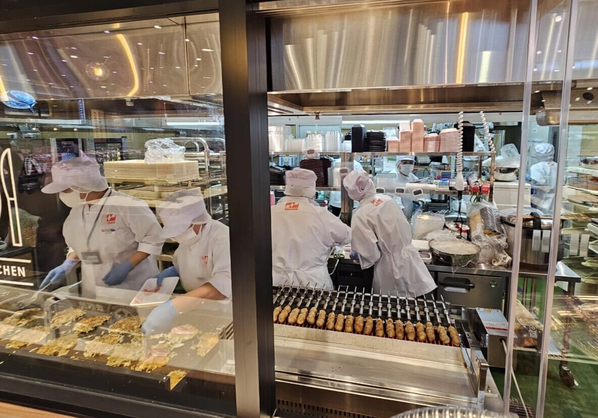 総菜は、ライブキッチンの最前面に焼き場を設け、焼鳥や焼きそばなどのメニューを提供する。