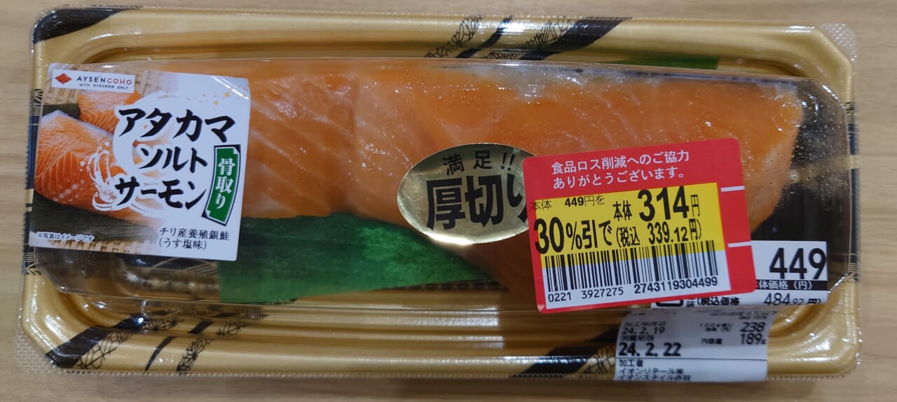 サーモンはノルウェー産、チリ産、チリ産のアタカマソルトサーモン(写真)など3種類を展開し、刺身や厚切りなど加工のバリエーションが豊富で選択肢の多さが魅力の売場となっている。刺身や切り身は商品自体にボリューム感があり、競合店との差別化となっている。