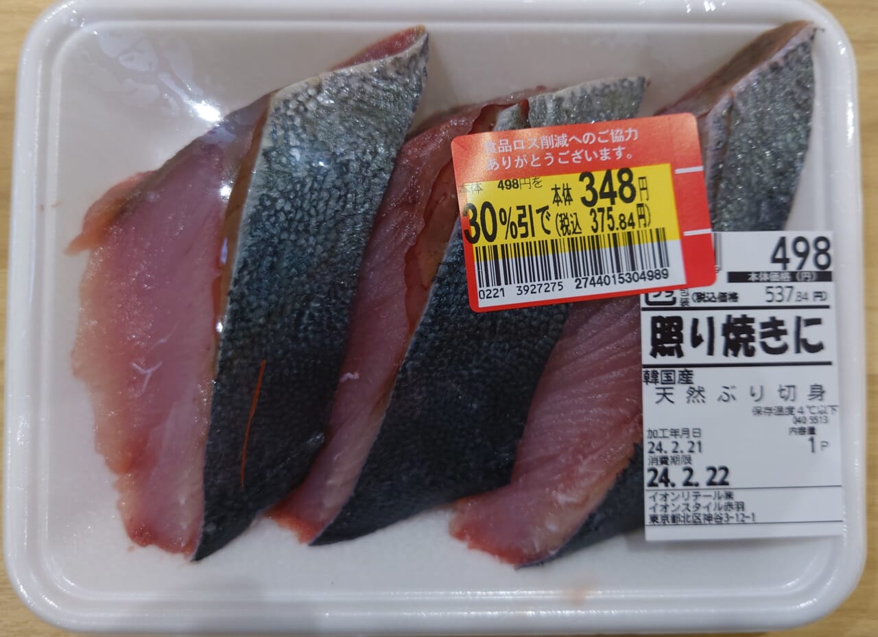 視察時は平日で雨模様だったため、丸魚ではなく加工された状態での商品展開だったが、それでもインパクトのある売場となっていた。厚切りのブリが3切れで498円(写真)と破格の価格で、隣にはブリのカマが200円で並んでいた。