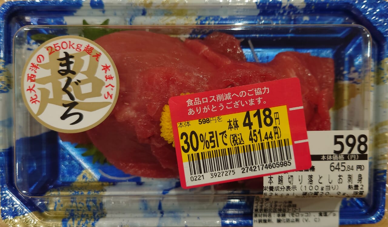 反対側の平台では、マグロとサーモンをコーナーでまとめ、専門性をアピールしている。売場トップのまぐろは価格訴求のしやすい「びんちょう」や「めばち」に加え、「本マグロ」でも店内加工の赤身の切り落としを1パック598円(写真)とお得感を出しながら展開し、手の伸ばしやすい品揃えとなっていた。