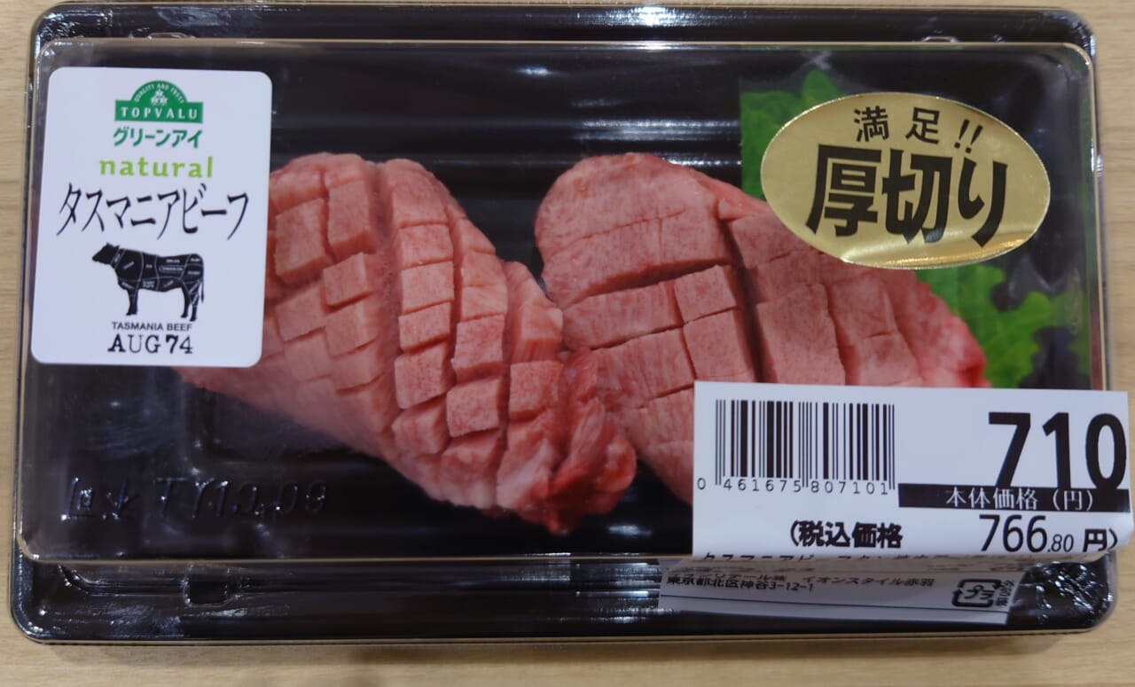 牛肉売場は、平日のためかボリューム感はなく、陳列量をコントロールしていたようだ。トップはPBのタスマニアビーフ(写真)で、そのほかに国産とアメリカ産を加えている。ブランド肉ごとのグルーピングではなく、焼肉、ステーキ、切り落とし等、用途や部位ごとにまとめられており、目的に応じた商品選択できるようにしている。