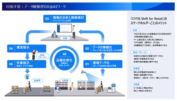 流通業界では、人手不足の課題に加えて、働き方改革や新型感染症の予防対策など、負荷のかかる作業が増加している。さらに、バックオフィスの仕事に従事する従業員のスキルや業務内容などの現場の状況の把握がしづらく、計画作成等の作業に時間がかかることが、生産性や利益率向上にとっての課題になっていた。CNS社は「CYTIS Shift for Retail」の提供を通して、これらの課題の解決を図り、流通業界のDX(デジタルトランスフォーメーション)を強力にサポートしていく。
