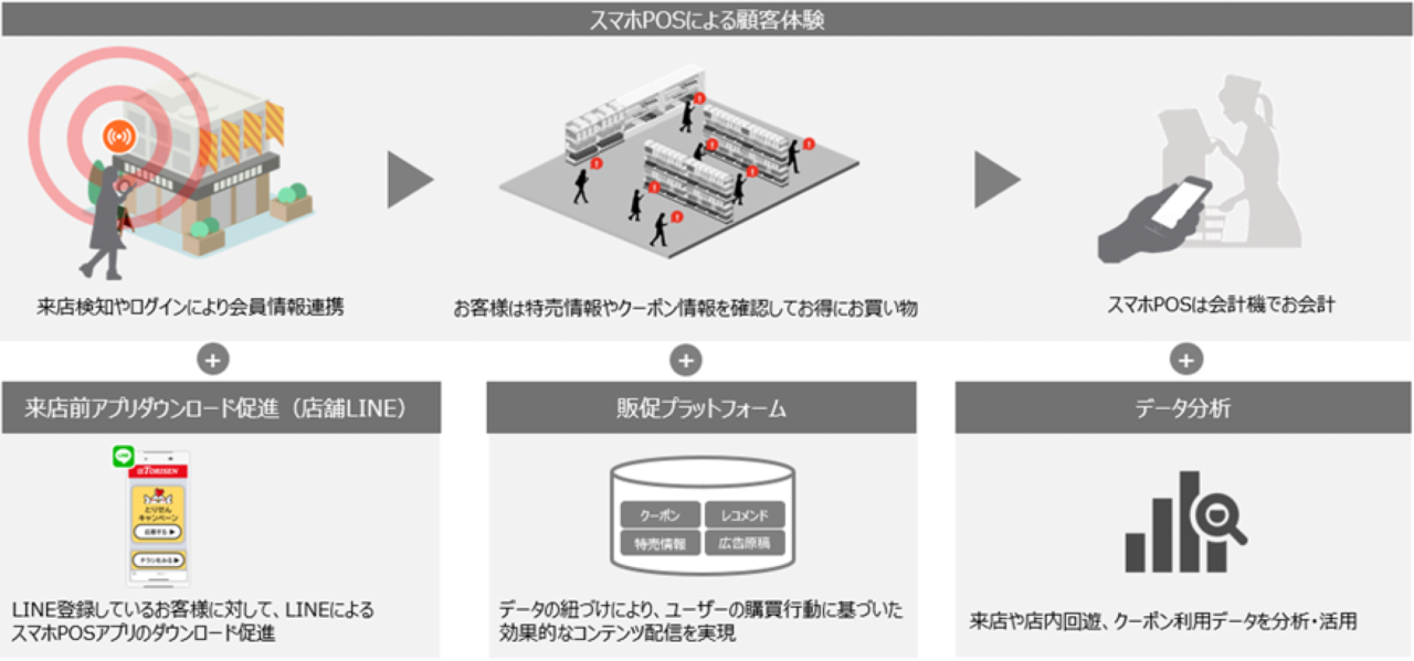 また、店舗内の顧客の行動データと購買データの分析においては、LINE公式アカウントからの誘導、スマホ型POSレジアプリの操作、配信したクーポンへの反応、Beacon検知による店内行動、POSデータ、顧客へのヒアリングなどをもとに、購買結果に及ぼす定量情報と、顧客の行動や思考の定性情報を分析し、実証実験の成果を検証する。