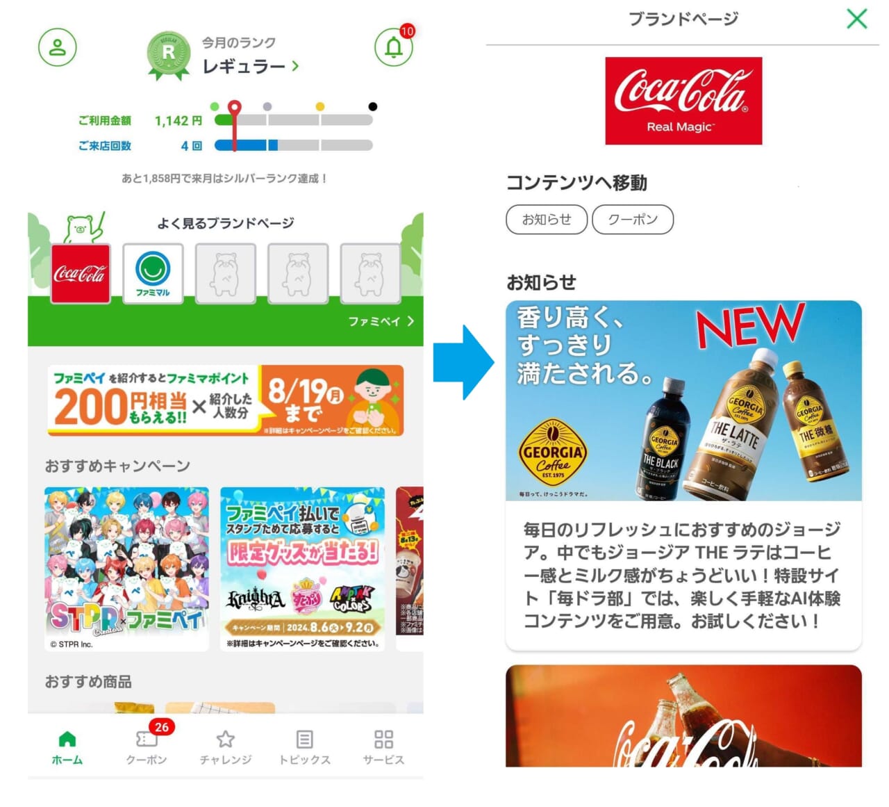 アプリ「ファミペイ」に新たに立ち上がったメーカー専用ページ。画像は日本コカ・コーラのページ