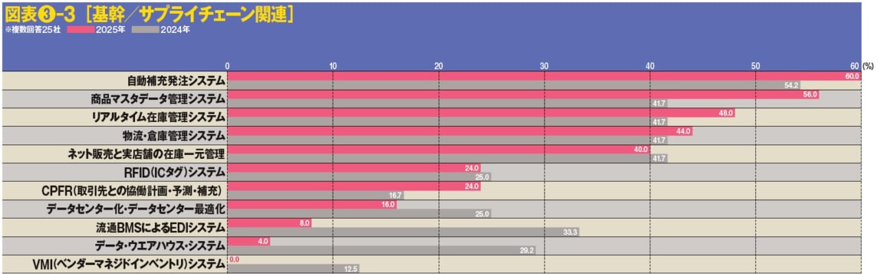 基幹システムやサプライチェーン関連(図表❸-3)では「自動補充発注システム」(60%)が3年連続の1位となった。続いて「商品マスタデータ管理システム」(56%)が2位となり、「リアルタイム在庫管理システム」(48%)が3位となった。