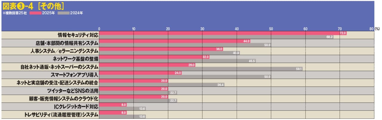 その他(図表❸-4)については、2年連続で「情報セキュリティ対応」(72%)が1位となった。続いて「店舗・本部間の情報共有システム」(44%)が2位、前回6位だった「人事システム/eラーニングシステム」(36%)が3位となった。
