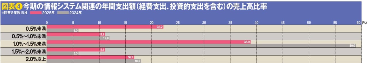 24年度の情報システム関連の年間支出額(図表❹)については、全体の約38.9%が「1.0%~1.5%未満」と回答した。