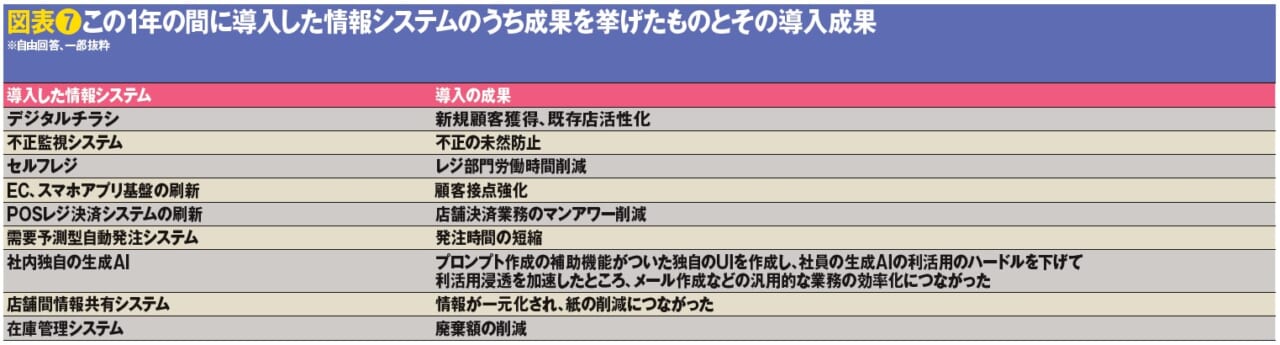 直近1年以内に導入したシステムのうち、成果を挙げたものはどのようなシステムで、具体的な成果はどのようなものだったのか(図表❼)について、自由記述での回答を求めた。とくに多く見られたのはセルフレジおよびフルセルフレジやPOSシステムの刷新により、決済業務やレジ部門の労働時間が削減できたという意見だ。