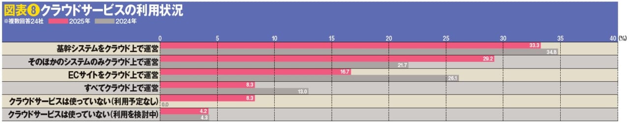 クラウドサービスの利用状況について(図表❽)は前回に引き続き「基幹システムをクラウド上で運営」(33.3%)が1位となった。次いで「そのほかのシステムのみクラウド上で運営」(29.2%)が2位、「ECサイトをクラウド上で運営」(16.7%)が3位となった。