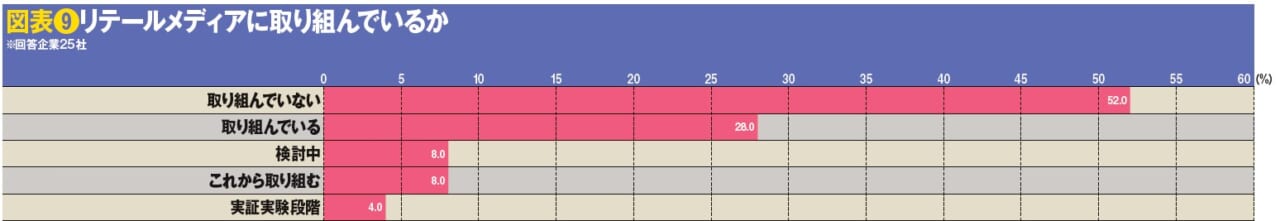 現在リテールメディアに取り組んでいるか(図表❾)について聞いたところ、「いいえ」(52%)が約半数を占めた。続いて「はい」(28%)が2位で、「実証段階中」と合わせると32%となった。残りが「開始予定」(8%)と「検討中」(8%)が同率で3位に並んだ。