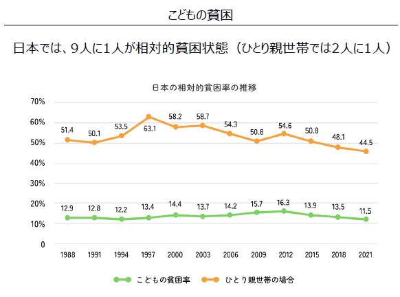 一方で、日本では「子どもの貧困」も深刻な社会課題になっている。厚生労働省「国民生活基礎調査」によると、21年時点で子どもの約9人に1人が相対的貧困(※ある国や地域の生活水準の中で比較したときに、大多数よりも貧しい状態のこと)状態にあるという。