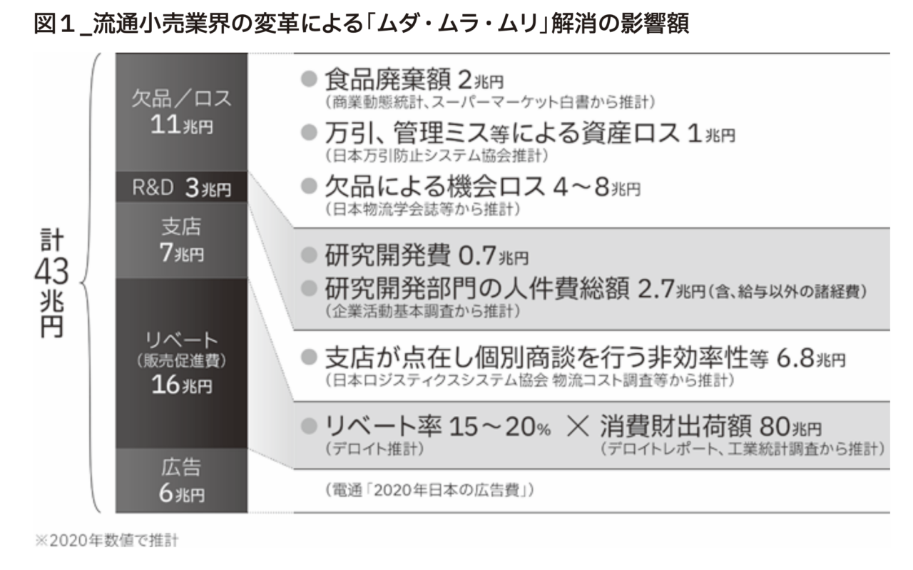 対して、日本の小売市場ではそうしたシステムの構築においては、欧米にはまったく追いついていないと言わざるを得ないと私は考えています。その状況下で、商品が消費者の手に届くまでにはかかっているすべてのコストのうち、約30%にあたる43兆円規模の部分にはさまざまな改善の余地があります。そこには過去の習慣に依存したムダがまだ多くあると私は考えています。